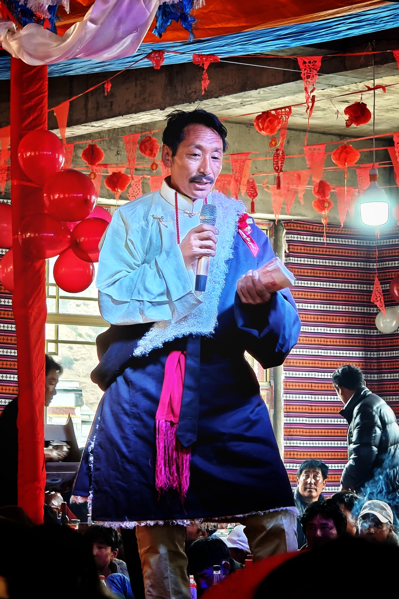 婚礼席间有歌舞表演,令我意外的是,表演者都是自愿报名参加,女的能舞,男的能唱。据说晚上的活动更为热闹,要跳集体舞!不过,听藏族小哥讲,这里的婚礼攀比风气很重,送的礼金多少都是现场麦克风报数的,给乡亲们带来了不小的压力。我刚开始因为听不懂藏语,只见主持人手里抓着把人民币,叽里咕噜讲了一大通,现在回想来应该是围绕着礼金在展开发挥吧。