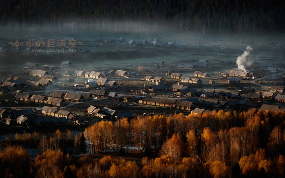 禾木村,早晨。淡淡的炊烟在晨光的照耀下,泛出幽幽的蓝色