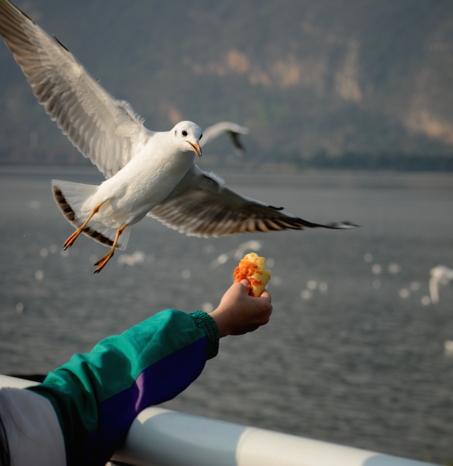 - 喂海鸥还是非常解压的户外活动,老少皆宜。异龙湖的海鸥比较羞涩胆小些,应该是游客少的缘故。但滇池的海鸥就很不一样了,胆子大的跟景区的泼猴有的一比。